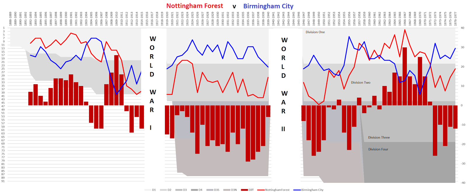 All in all, in the 76 years Forest and Birmingham had been in the league the "brummies" had finished above us on 46 occasions. Obviously, the other 30 Forest were on top. Birmingham's average league position had been 20th, compared to Forest's 24th.
